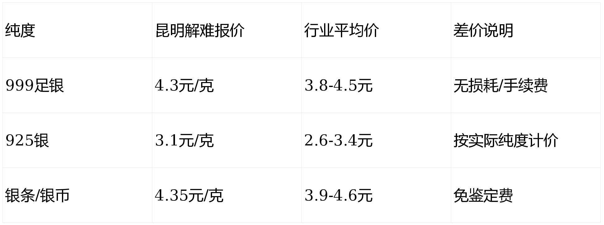 昆明解难典当行:实时国际银价4.3元/克,当面检测纯度(999银按足银计价),无任何附加费用